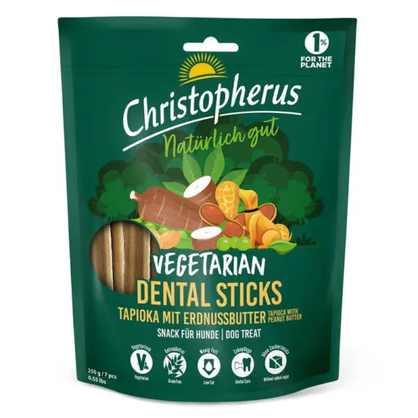 A Christopherus vegetáriánus dental stick egy kíméletes, mégis hatékony fogápoló rágóka, amelyet kifejezetten húsmentes étrendet követő vagy érzékeny emésztésű kutyáknak fejlesztettek ki. Földimogyoróvajjal és tápiókával készül, gabonamentes receptúrával – finom, és támogatja a fogak természetes tisztulását.